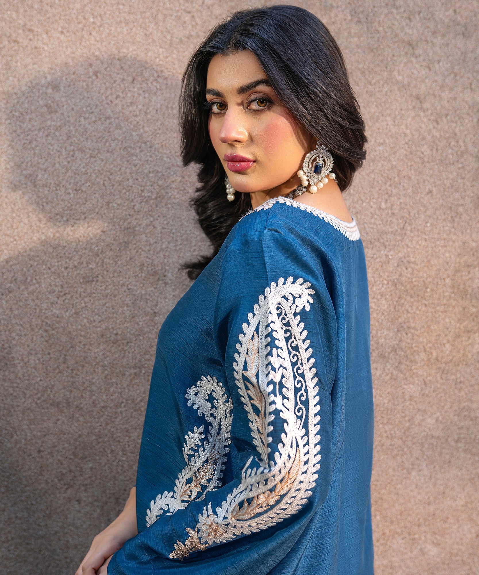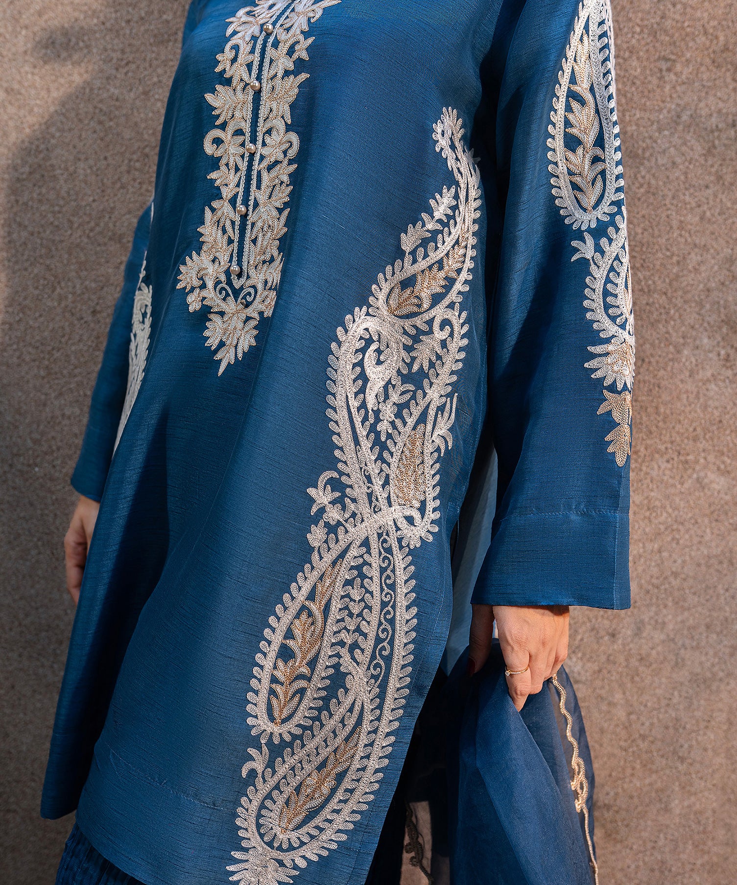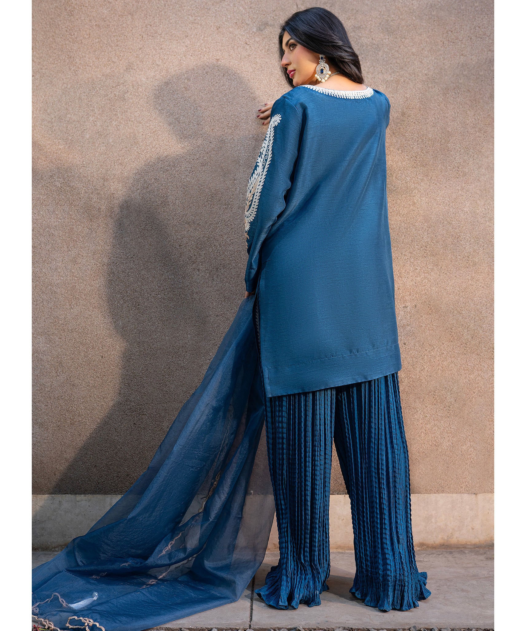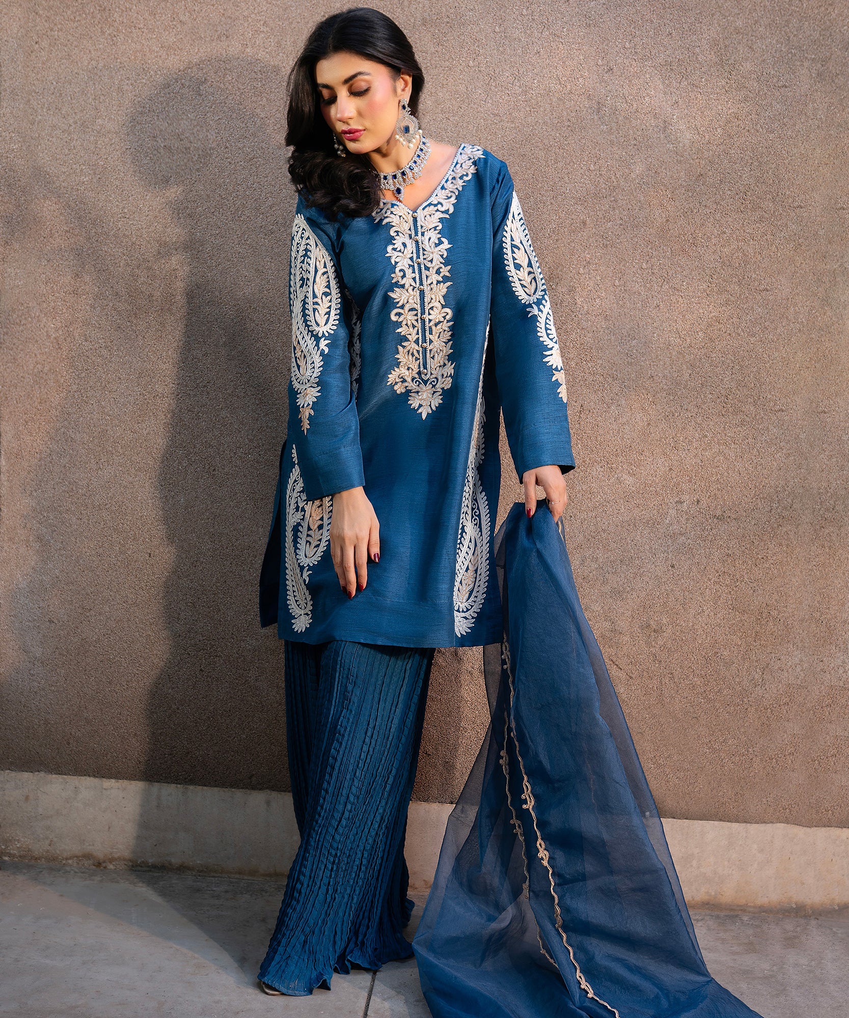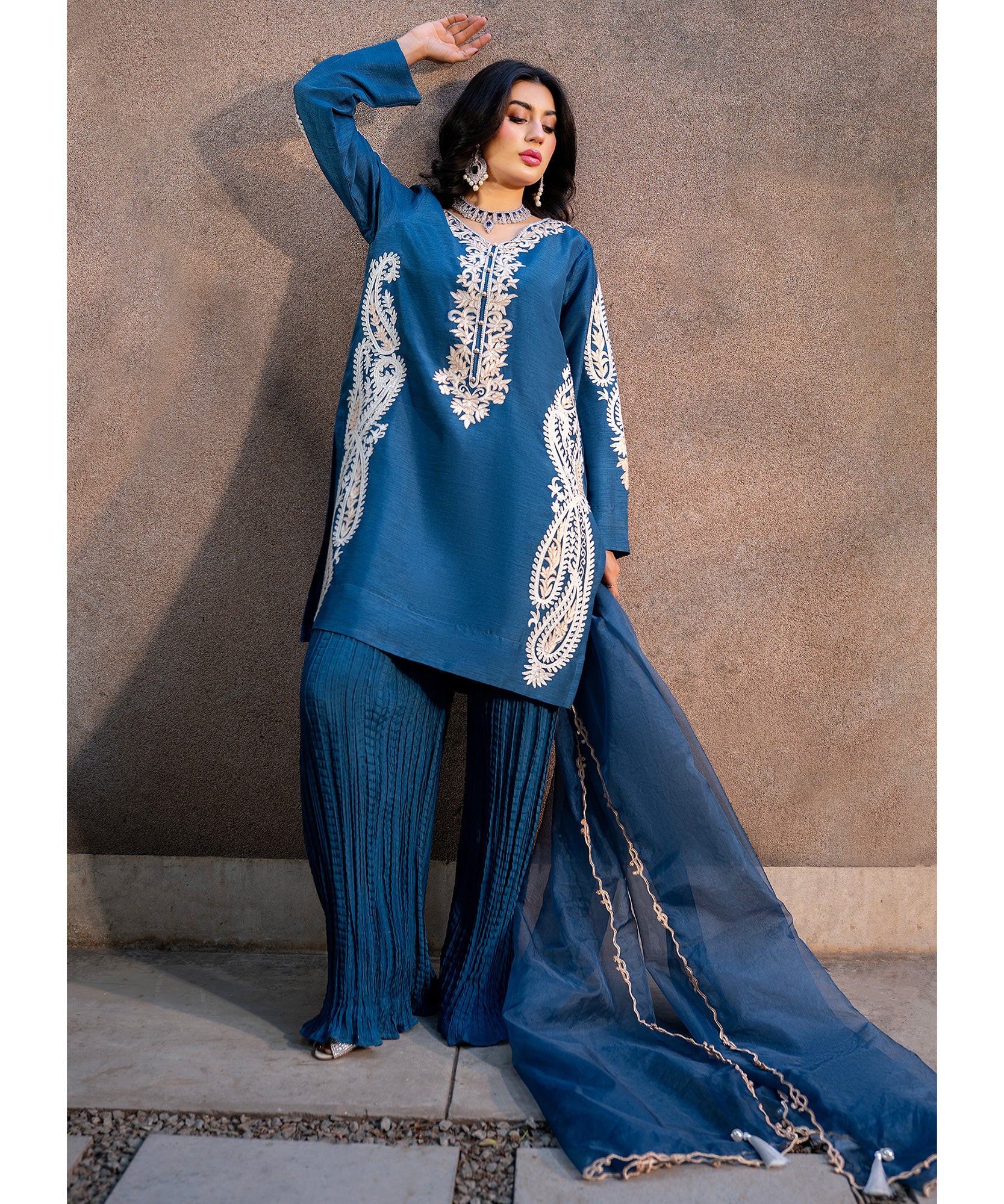 This blue raw-silk shirt with aari embroidery, paired with crushed lehar pants exudes effortless sophistication. The organza dupatta features fine thread-work and tassel details, capturing the soft elegance of timeless style. Ideal for semi-formal or festive events.