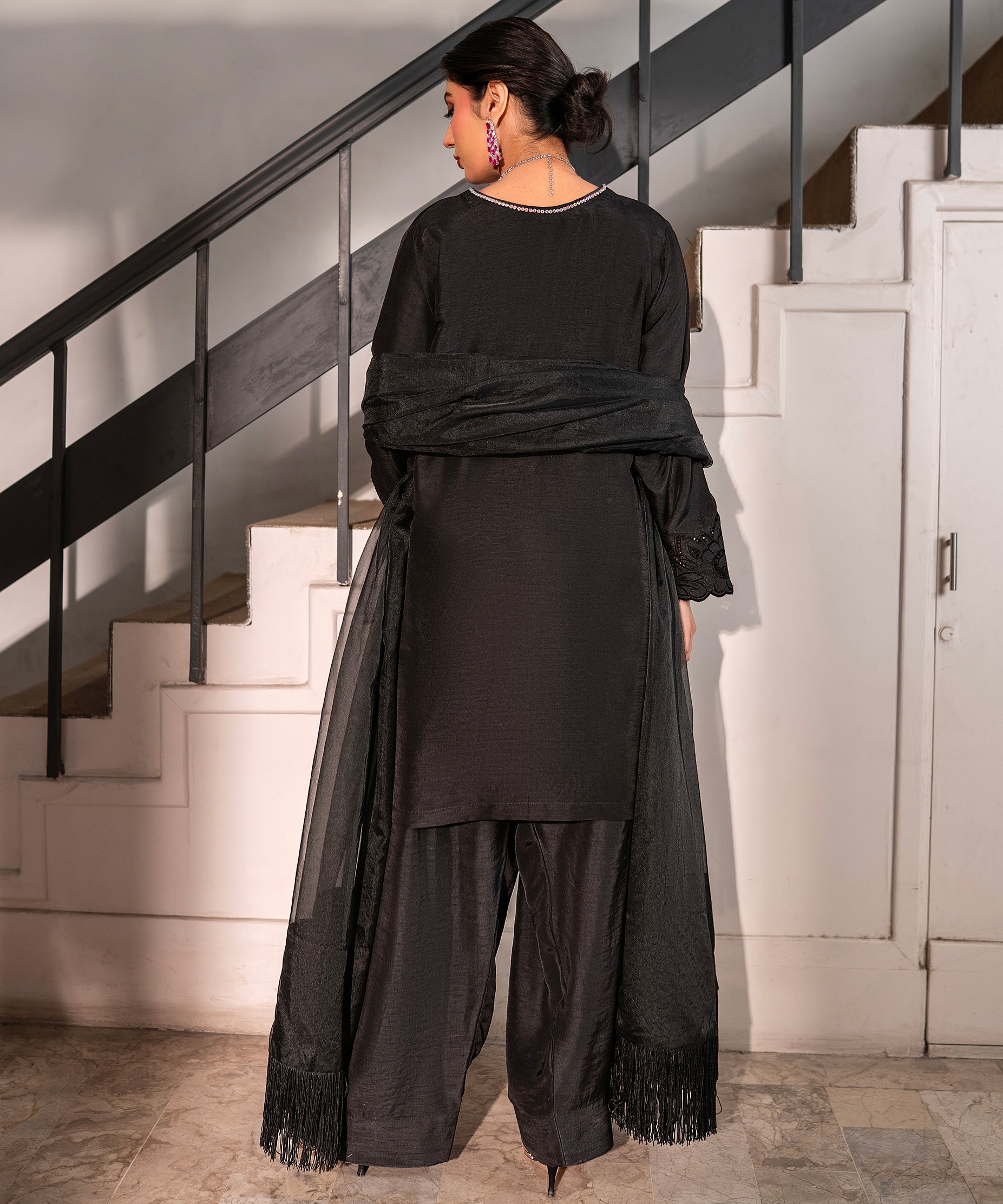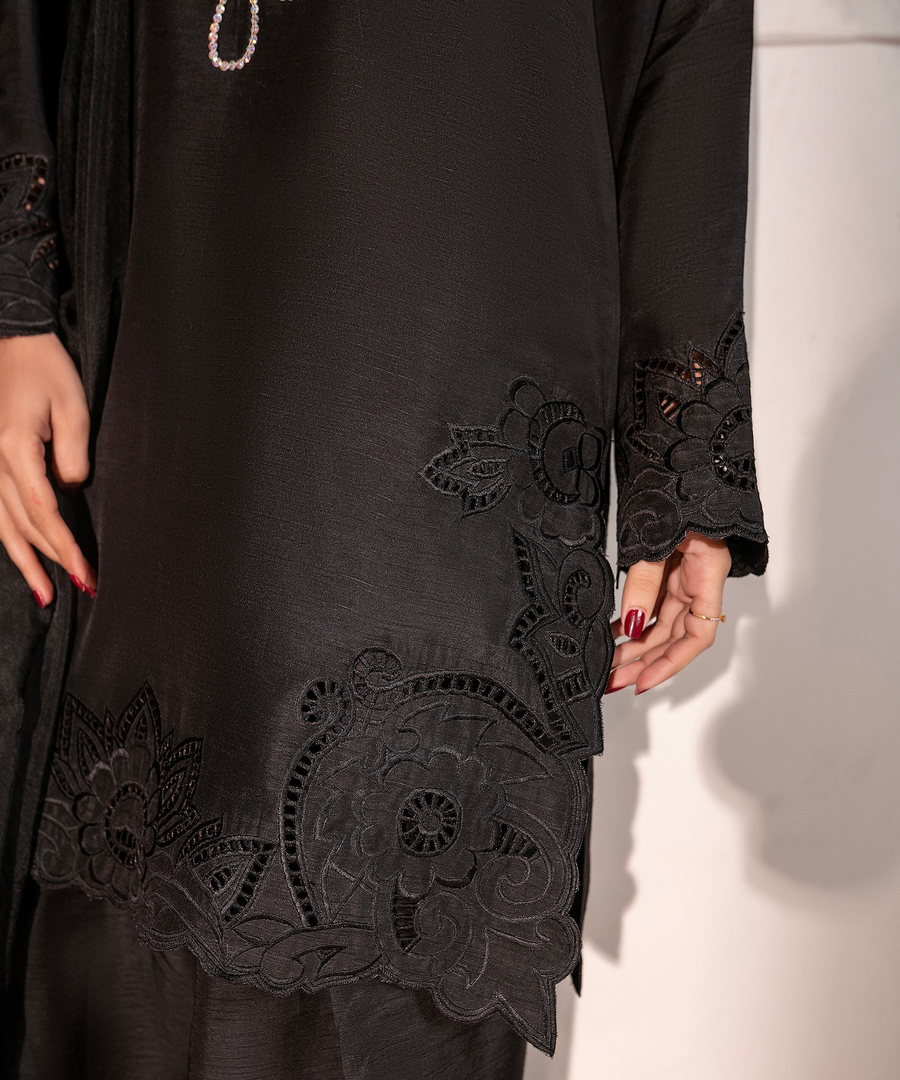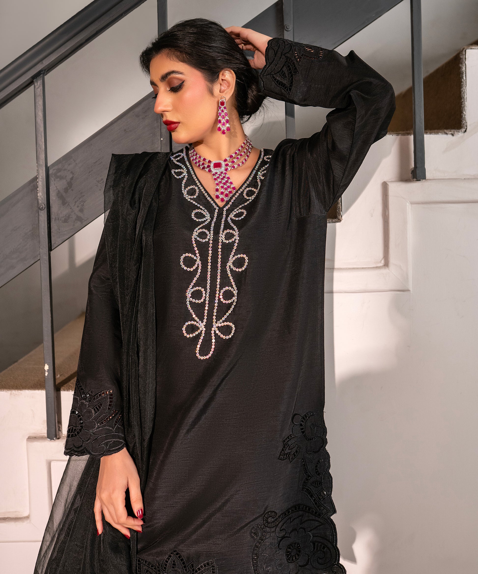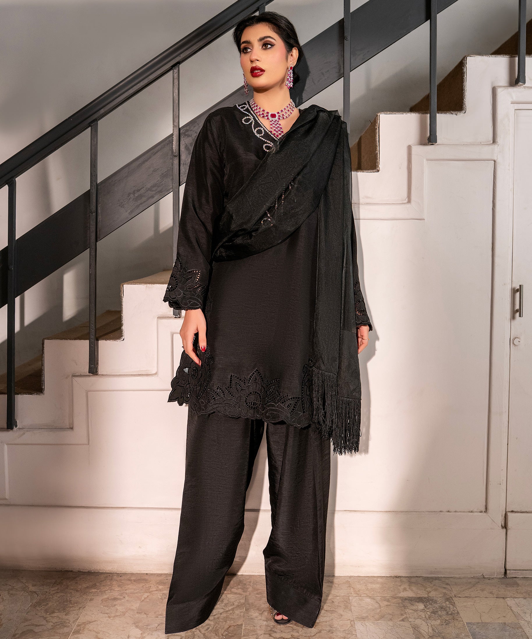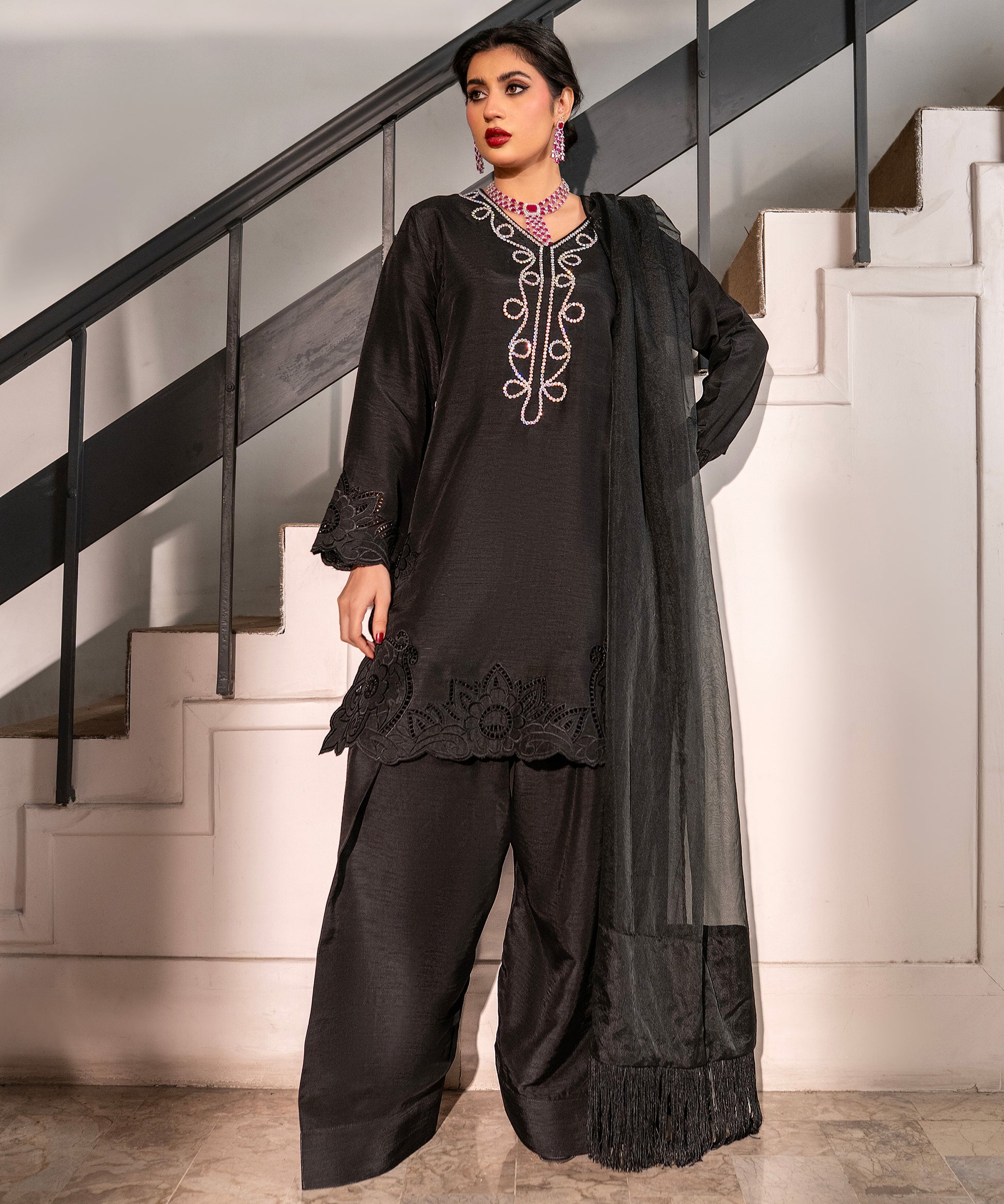 Make an elegant statement in this black raw-silk cut-work embroidered shirt featuring a crystal-work neckline. Paired with a farshi shalwar and an organza dupatta finished with shamose lace and tassels, the look embodies timeless glamour. Perfect for evening wear, festive dinners, or formal gatherings.