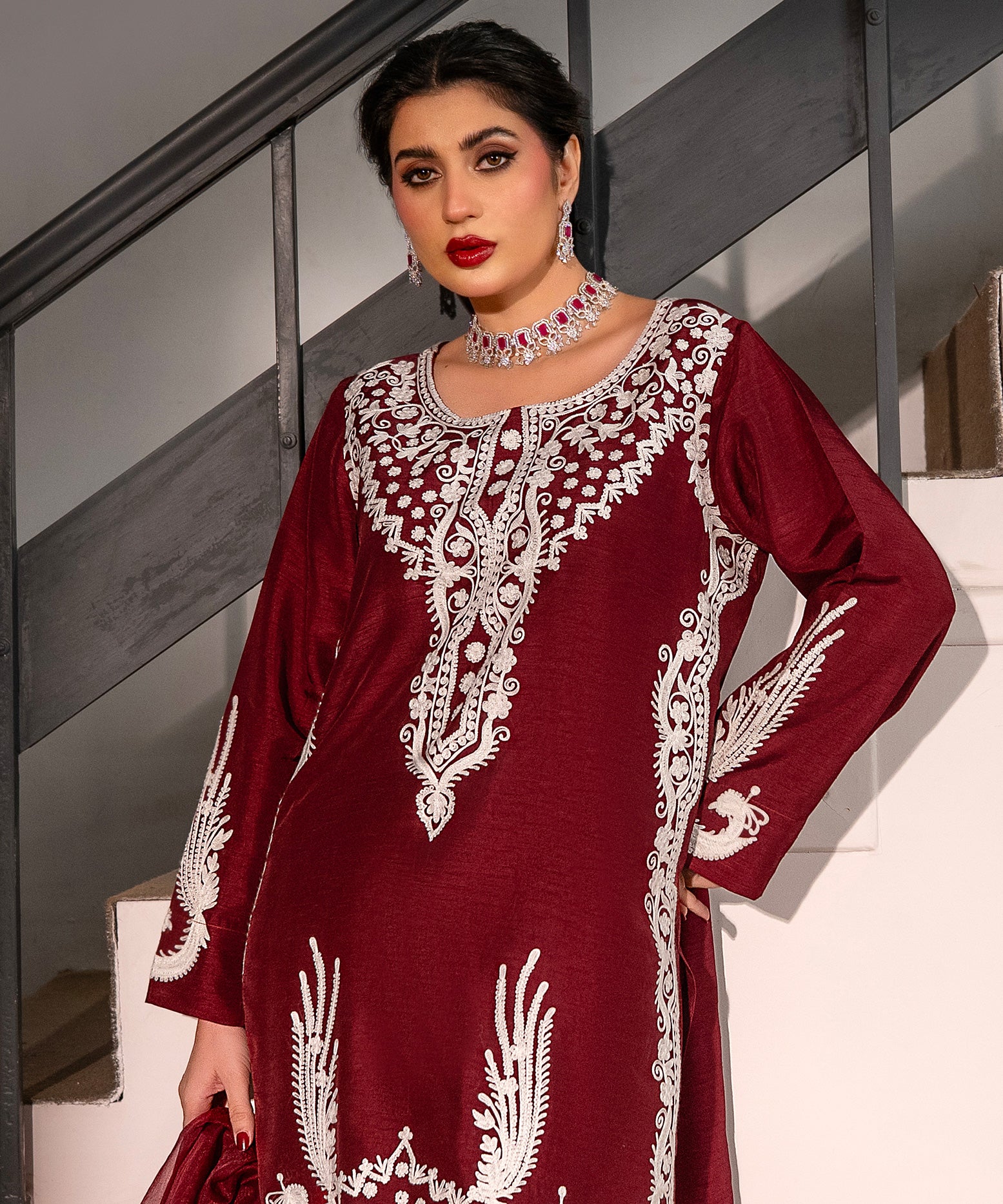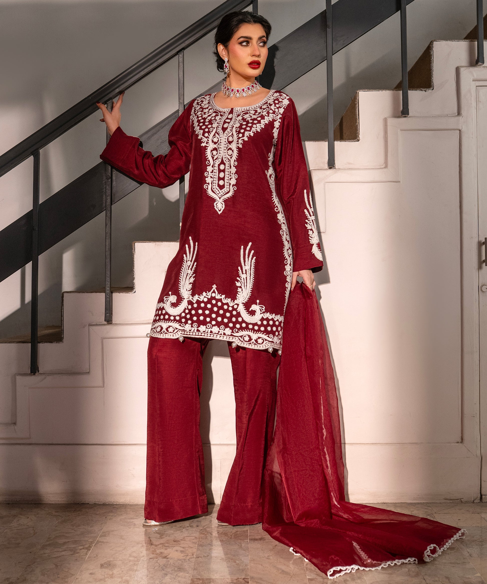Maroon Embroidered Shirt with Wide-Leg Pants and organza dupatta