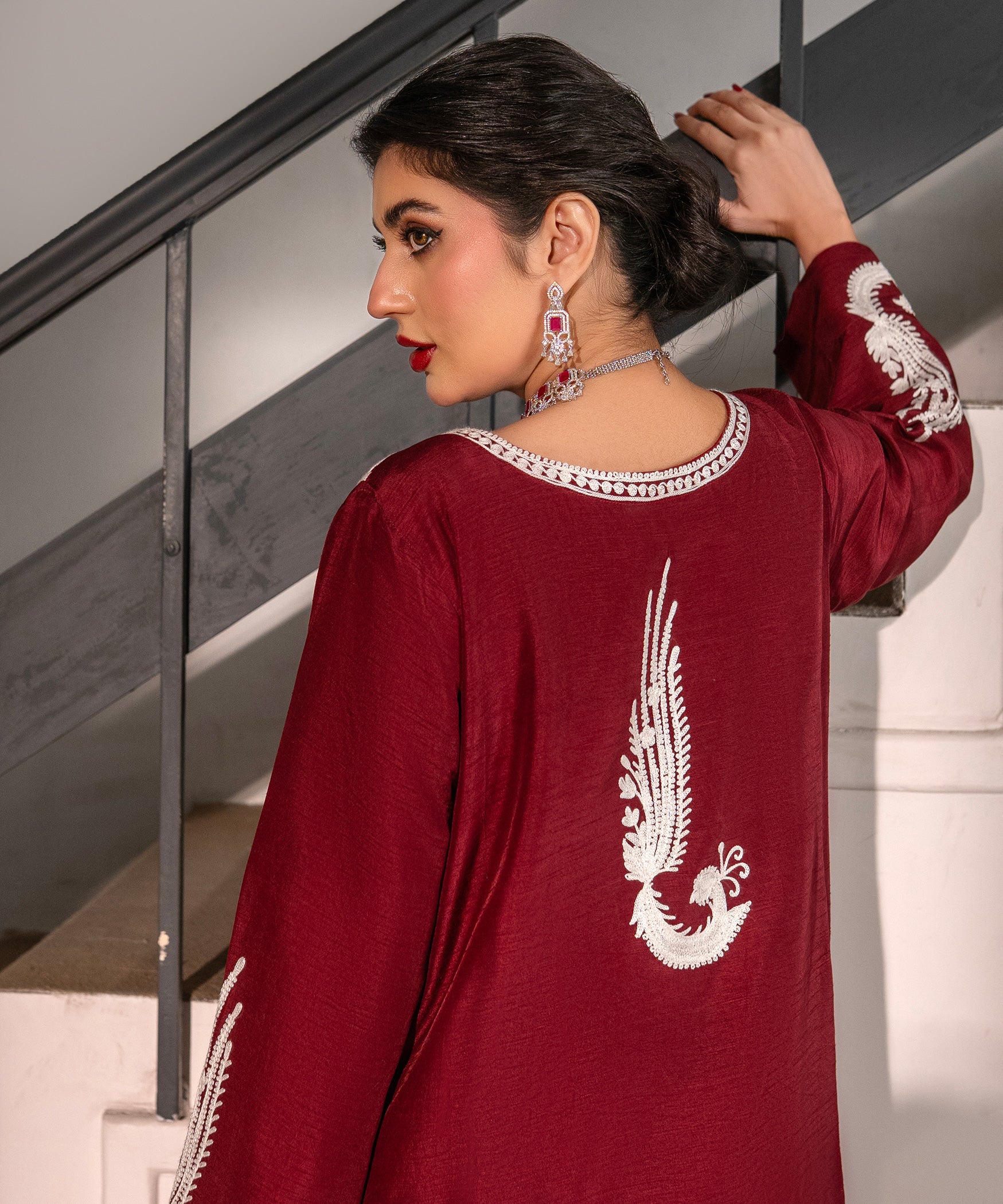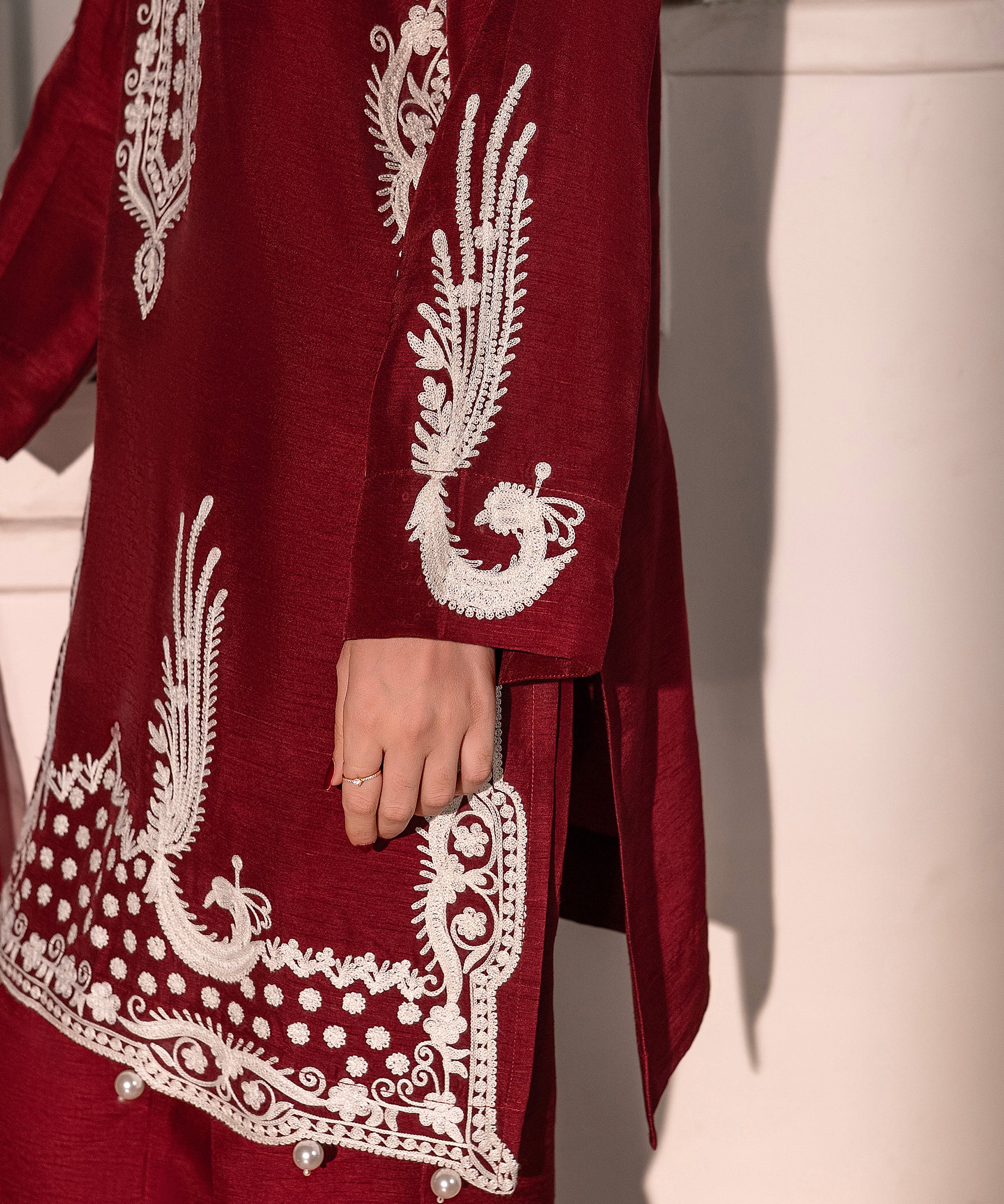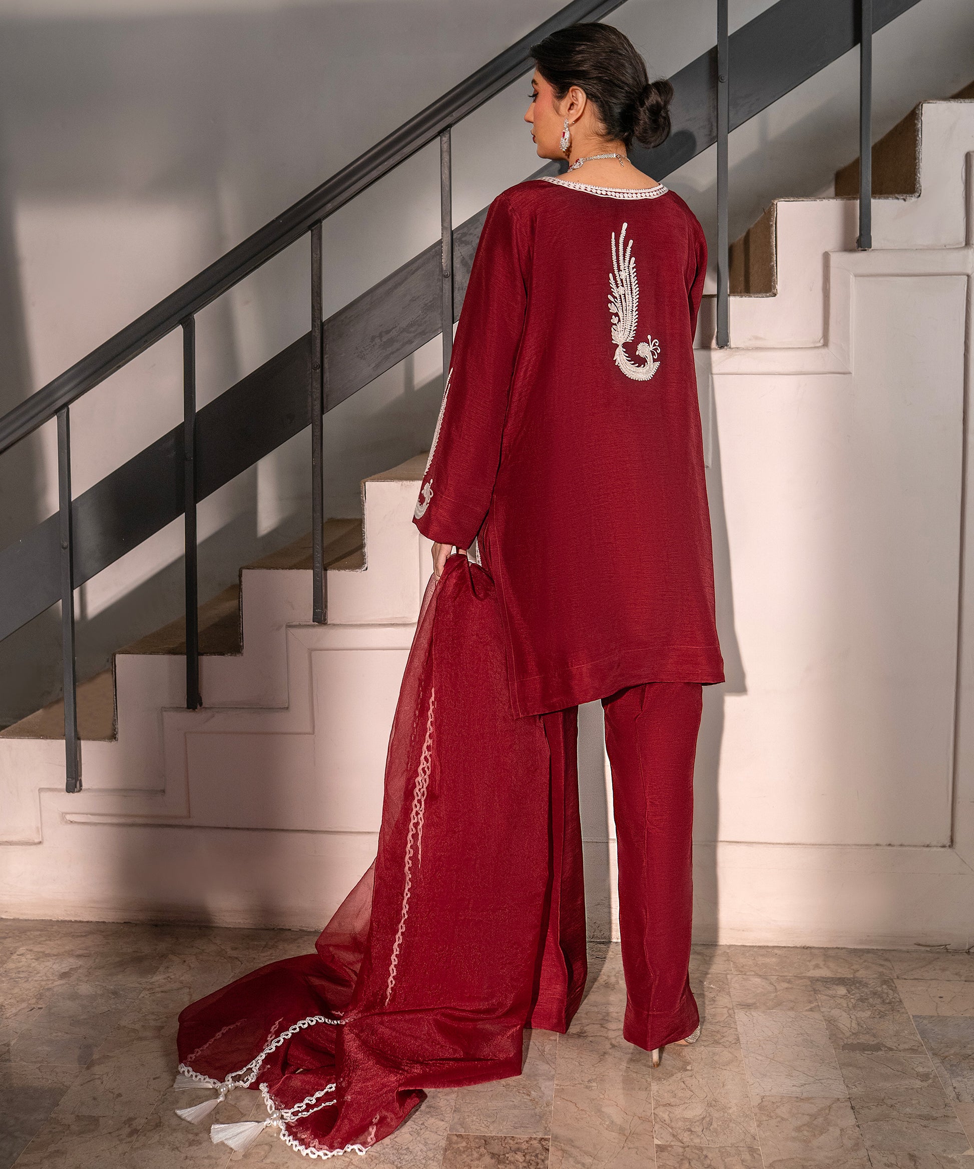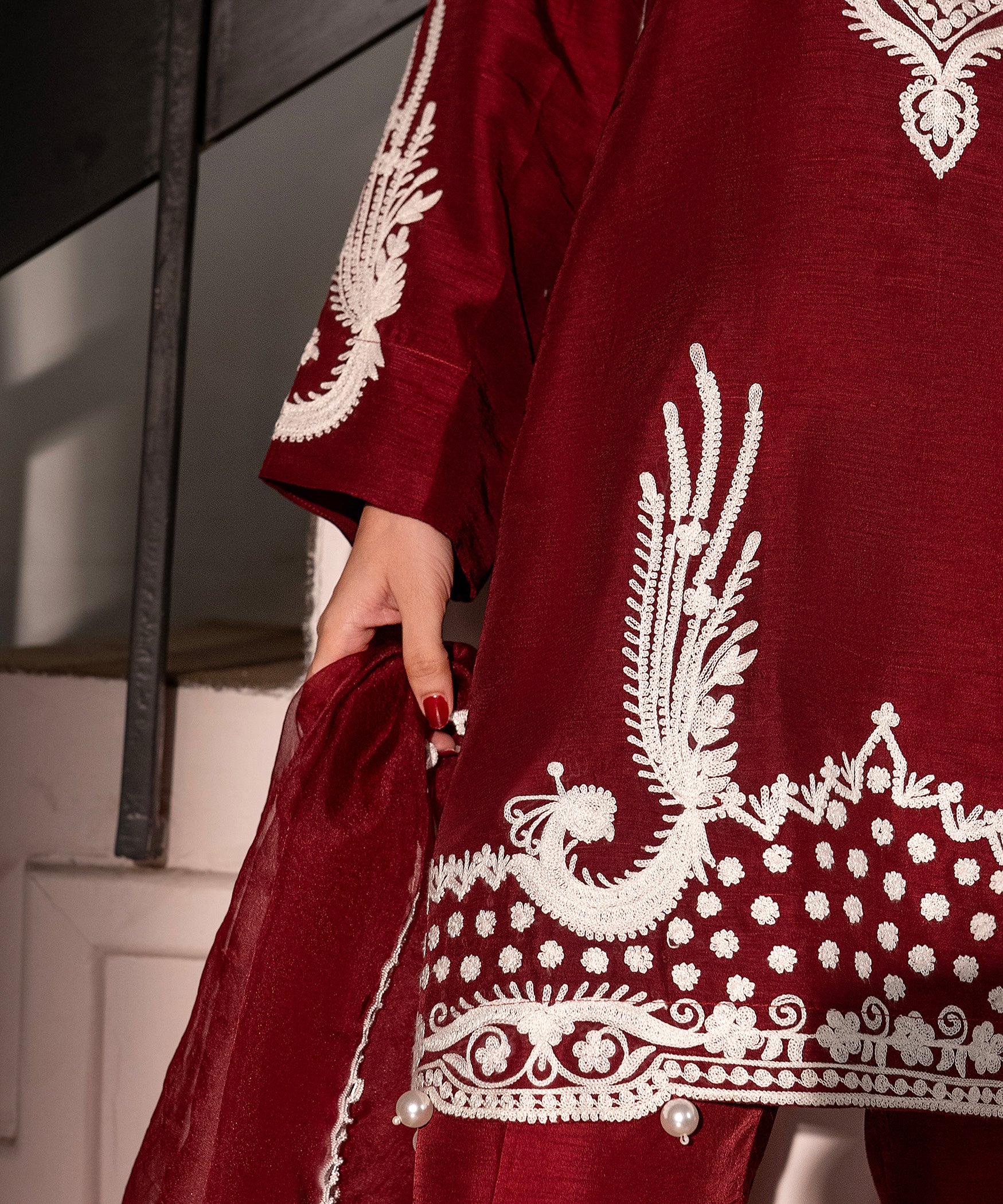 Elevate your festive wardrobe with this maroon raw-silk aari embroidered shirt paired with matching raw-silk wide-leg pants and a sheer organza dupatta, intricately embellished with thread embroidery and tassel edging, adding a graceful finish. Perfect for formal occasions, festive gatherings, or evening wear, this ensemble blends traditional artistry with modern charm.