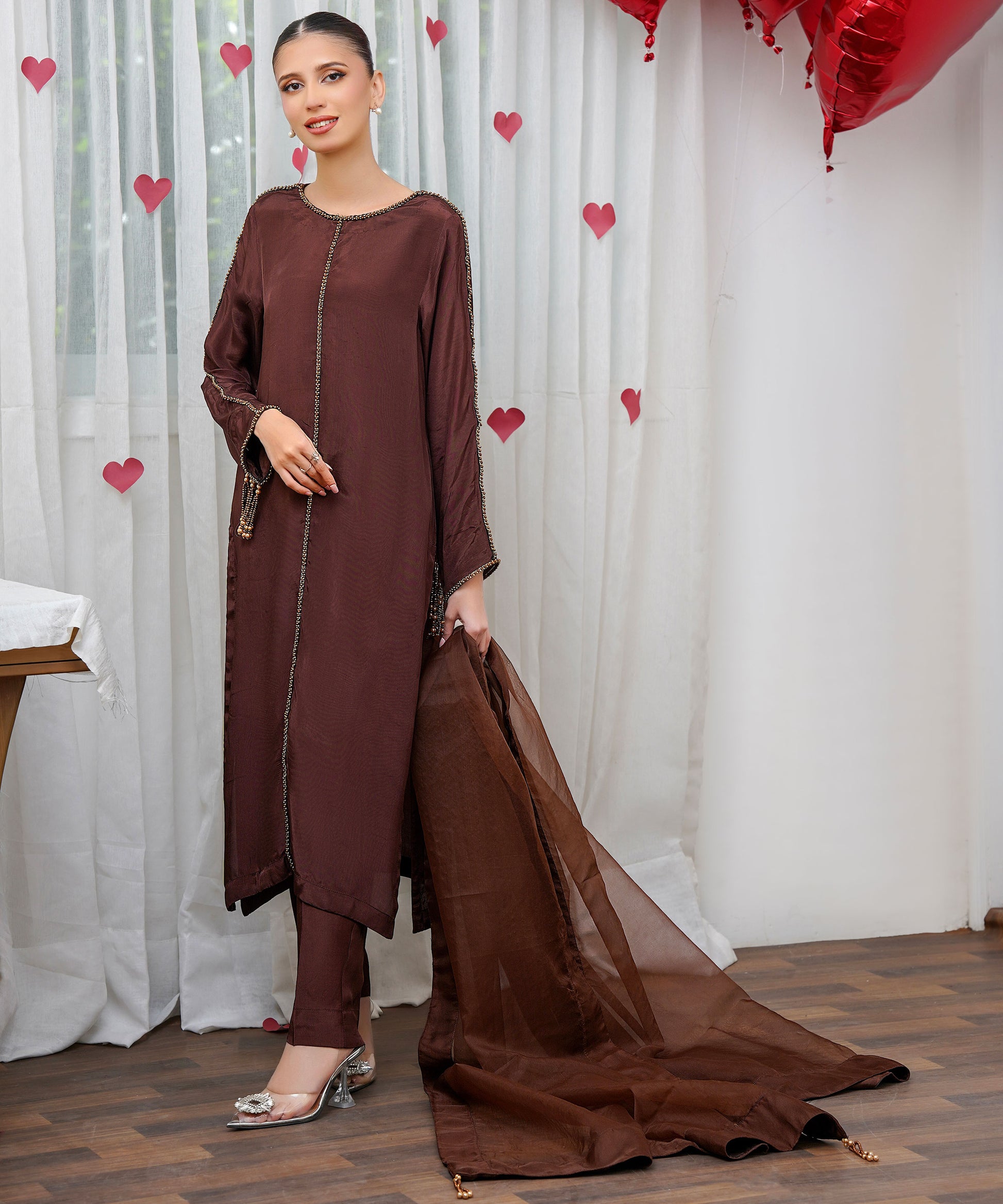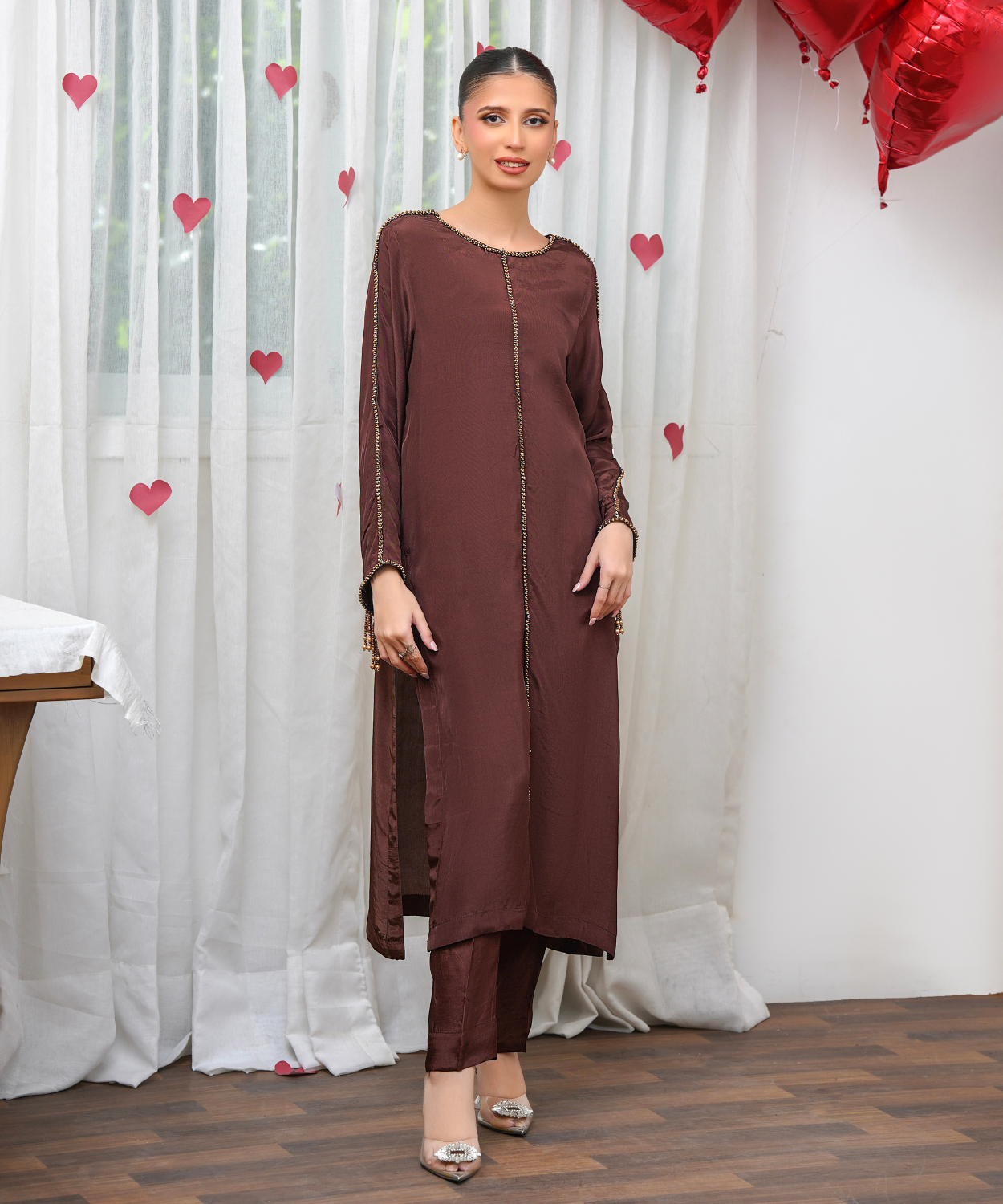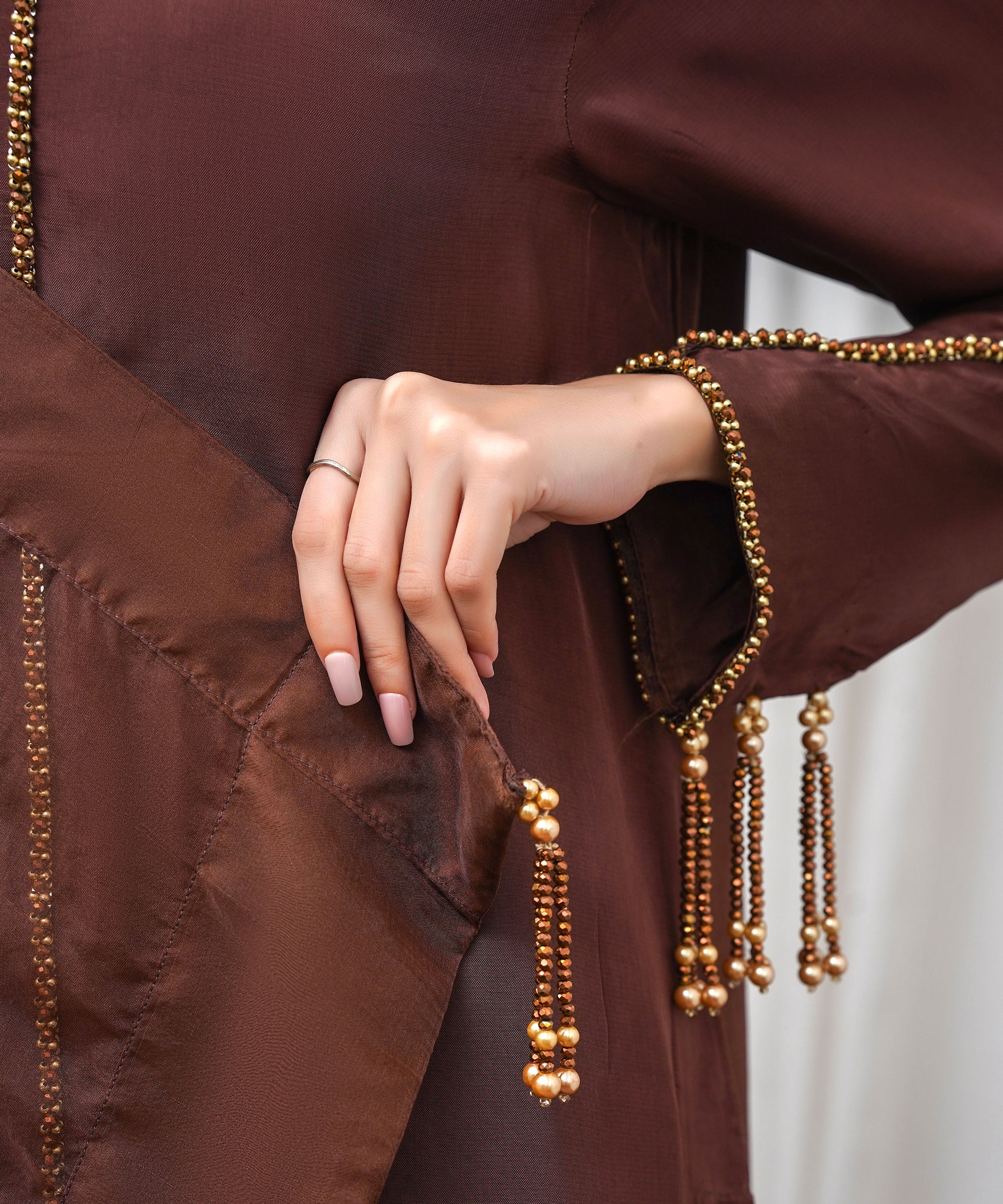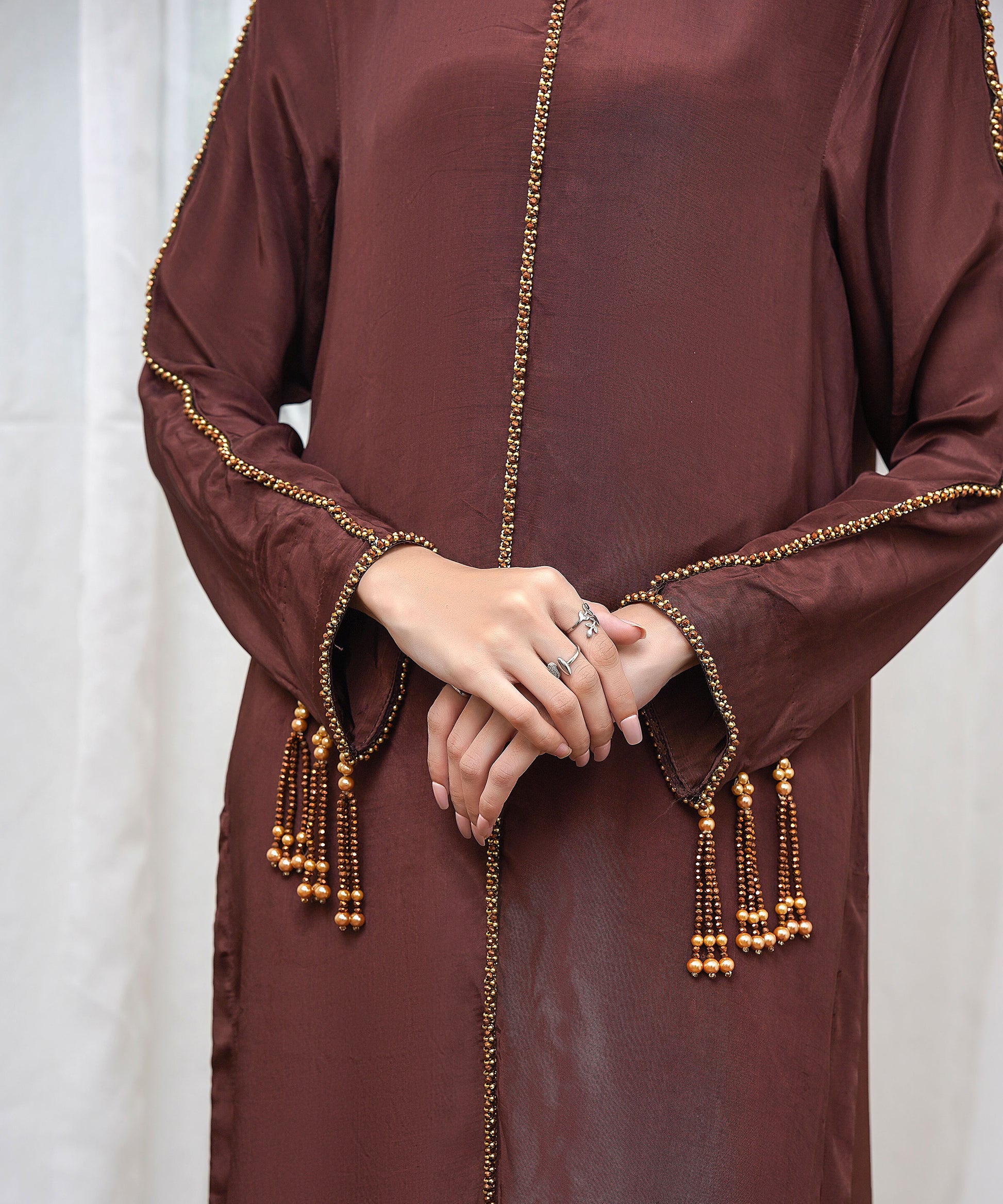 A rich brown long shirt with straight pants, crafted from pure Italian silk with a luminous shine. The highlight of this design is the exquisite handmade moti cutdana work delicately placed overall on the sleeves, shoulders, long vertical lines down the front , adding a luxurious sparkle to every detail. Handmade tassels hang gracefully on the sleeves (3 on each side) and across all four sides of the organza dupatta, making this outfit both statement-worthy and elegant. Lightweight, flowy, and comfortable — perfect for semi-formal wear.