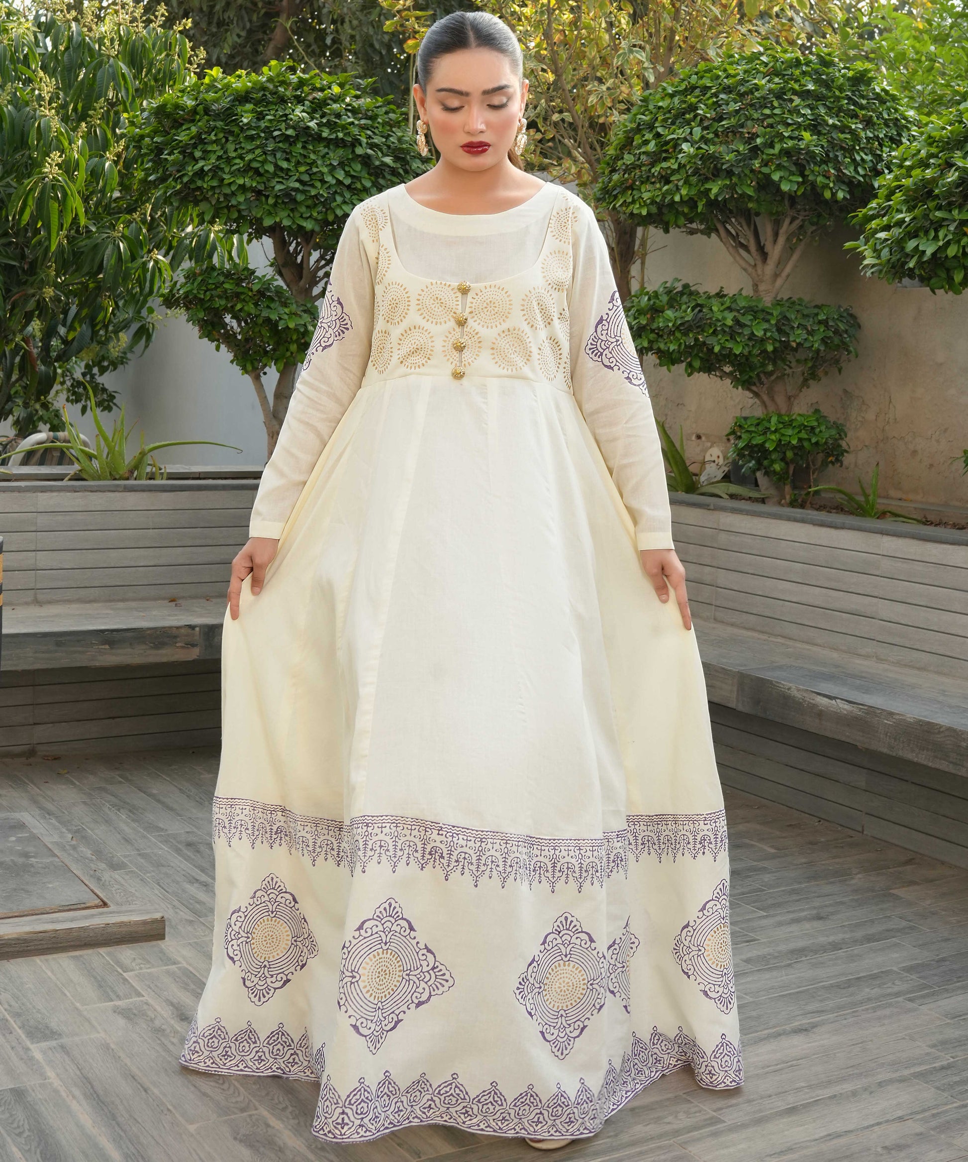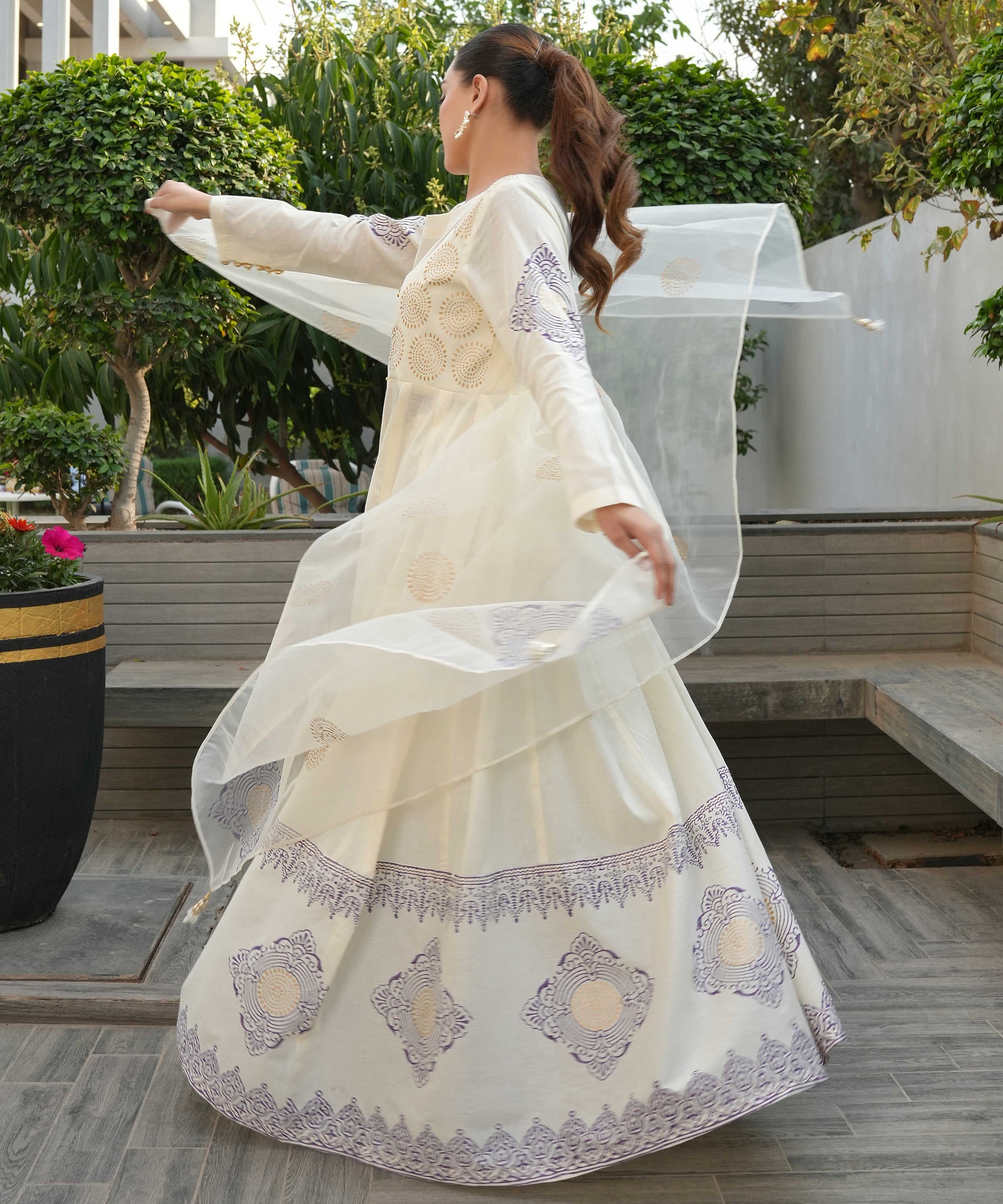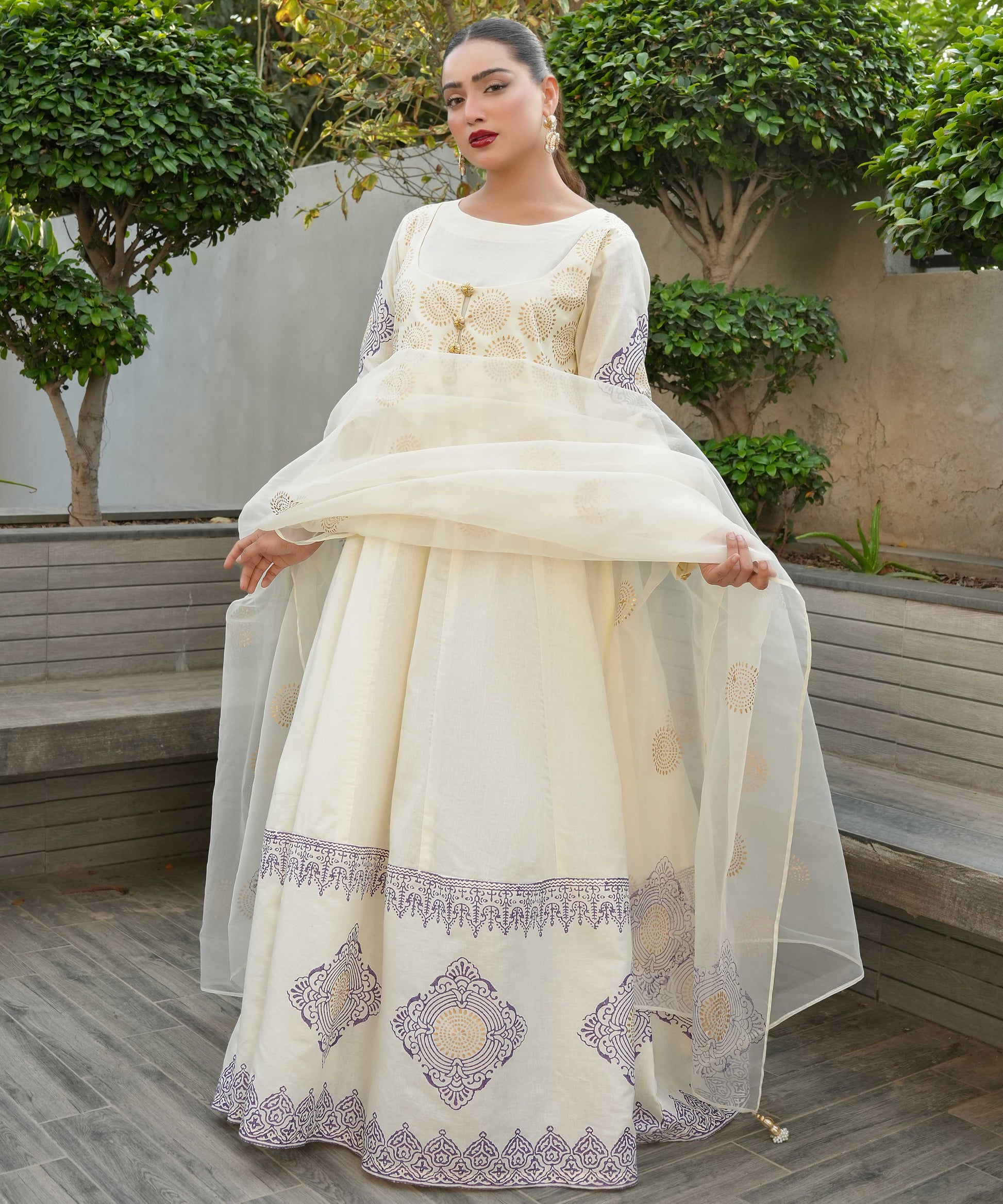 A name that echoes sophistication, Sofia is designed for those who love understated beauty. The motto white peshwas is adorned with floral and geometric block prints, flowing seamlessly from the chest to the hem. The sleeve ends and chest are detailed with luminous gota buttons, adding a subtle shimmer. The block-printed white organza dupatta, edged with twinkling gota tassels, enhances the dreamy, celestial feel of this ensemble. Paired with straight cotton trouser.