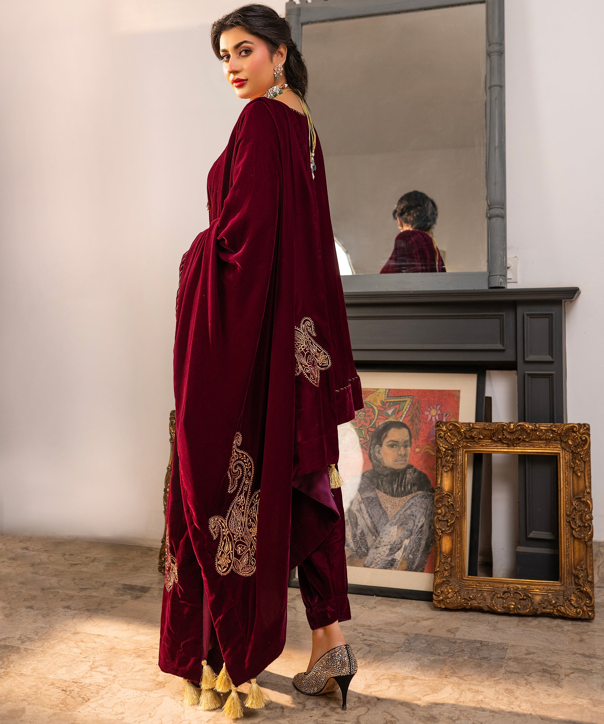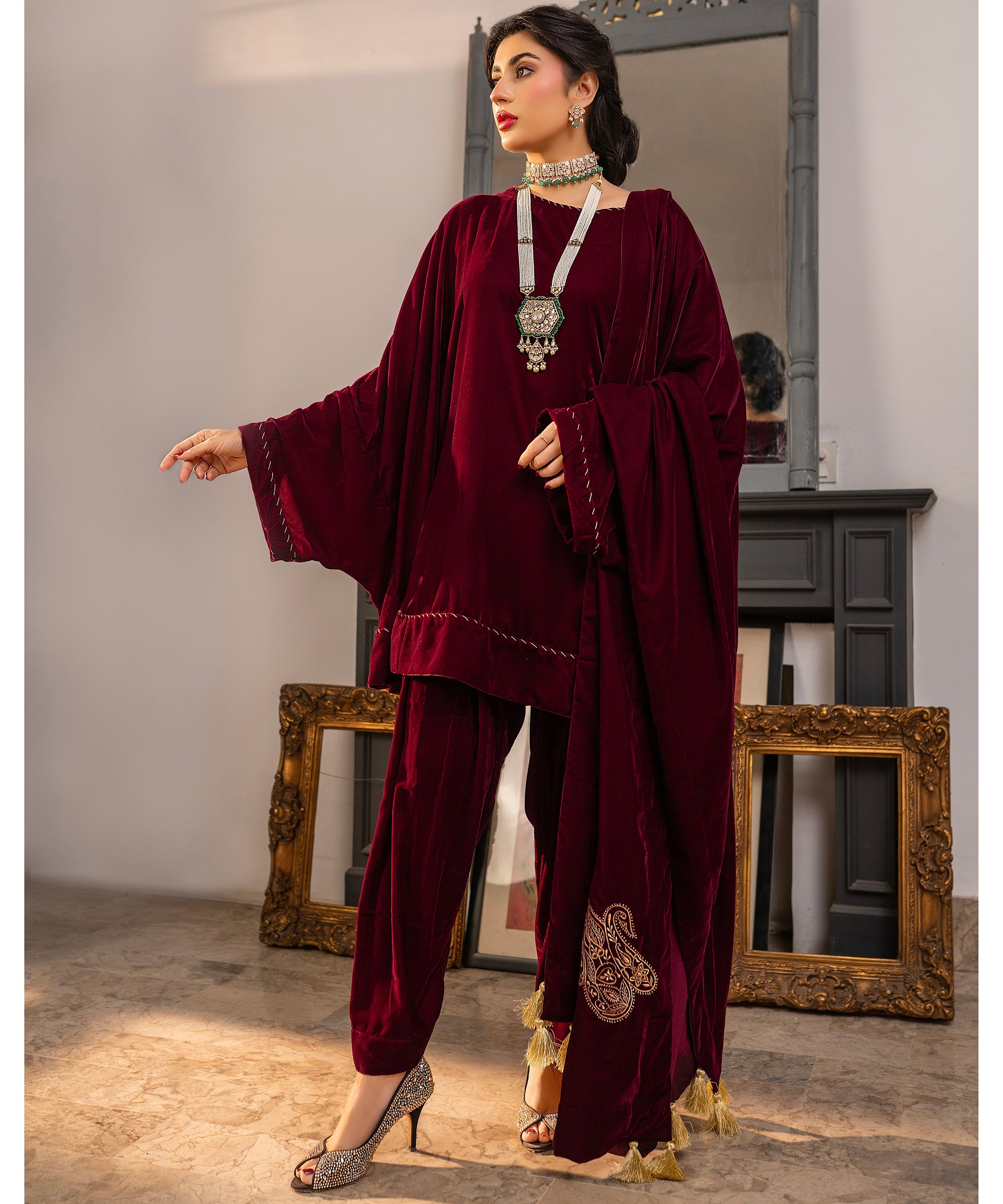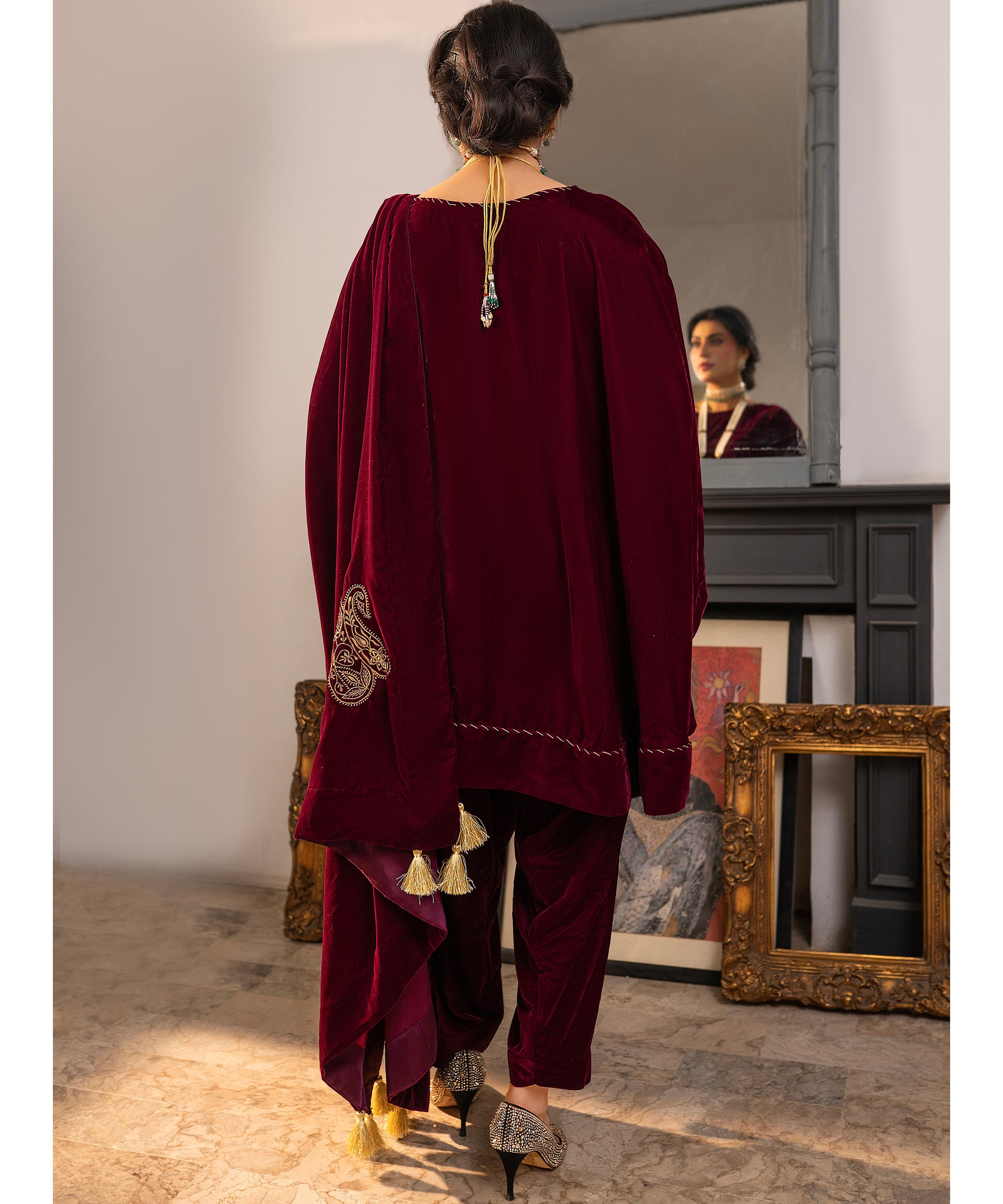 A richly detailed plum velvet peplum shirt paired with a skinny shalwar, exquisitely embellished with hand-worked Kacha Tanka along the sleeves, neckline, and daman. The look is completed with a matching velvet shawl, with shamose finishing intricately embroidered with Kashmiri paisleys and tassels on all four corners showcasing a poetic blend of heritage and elegance.