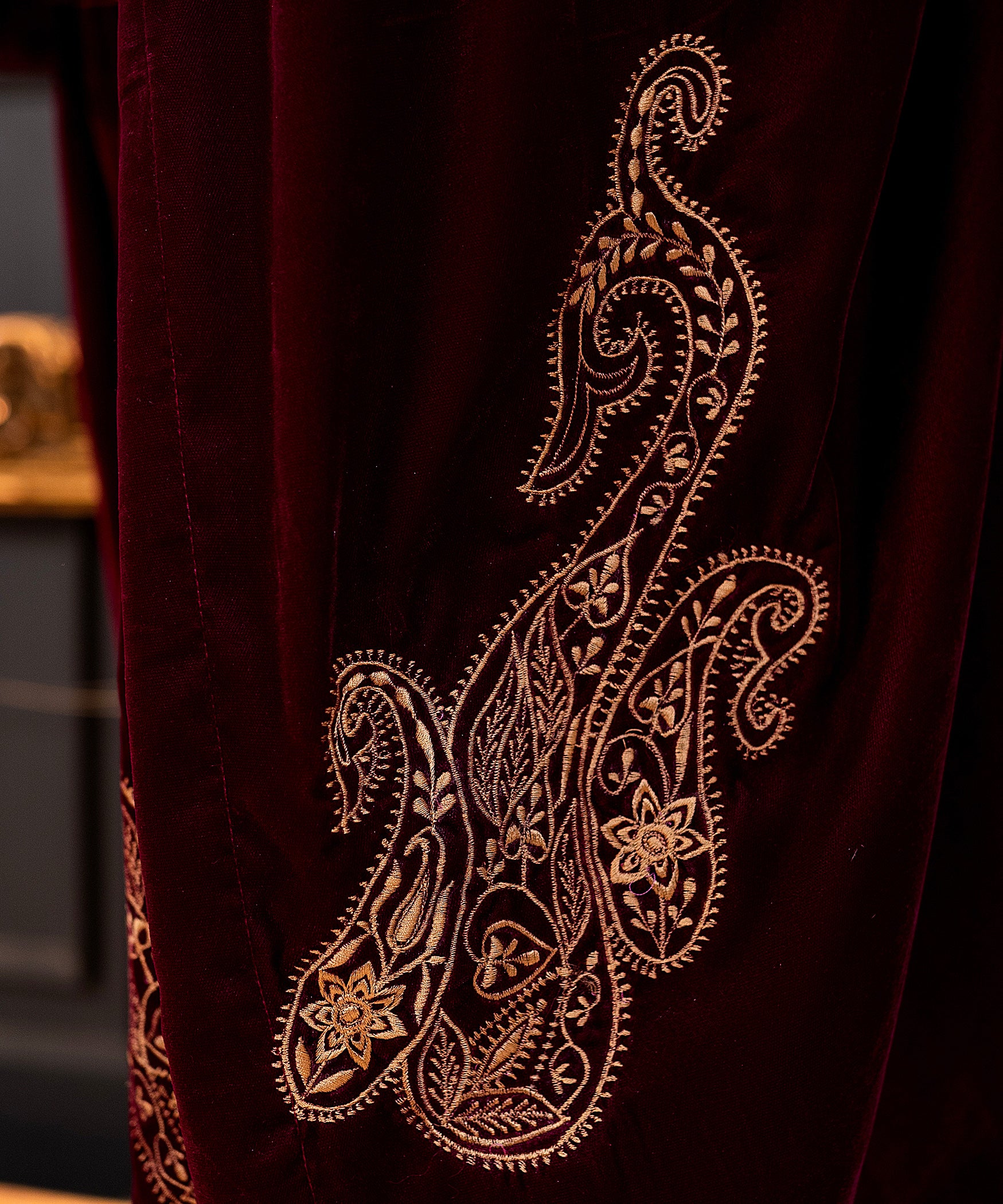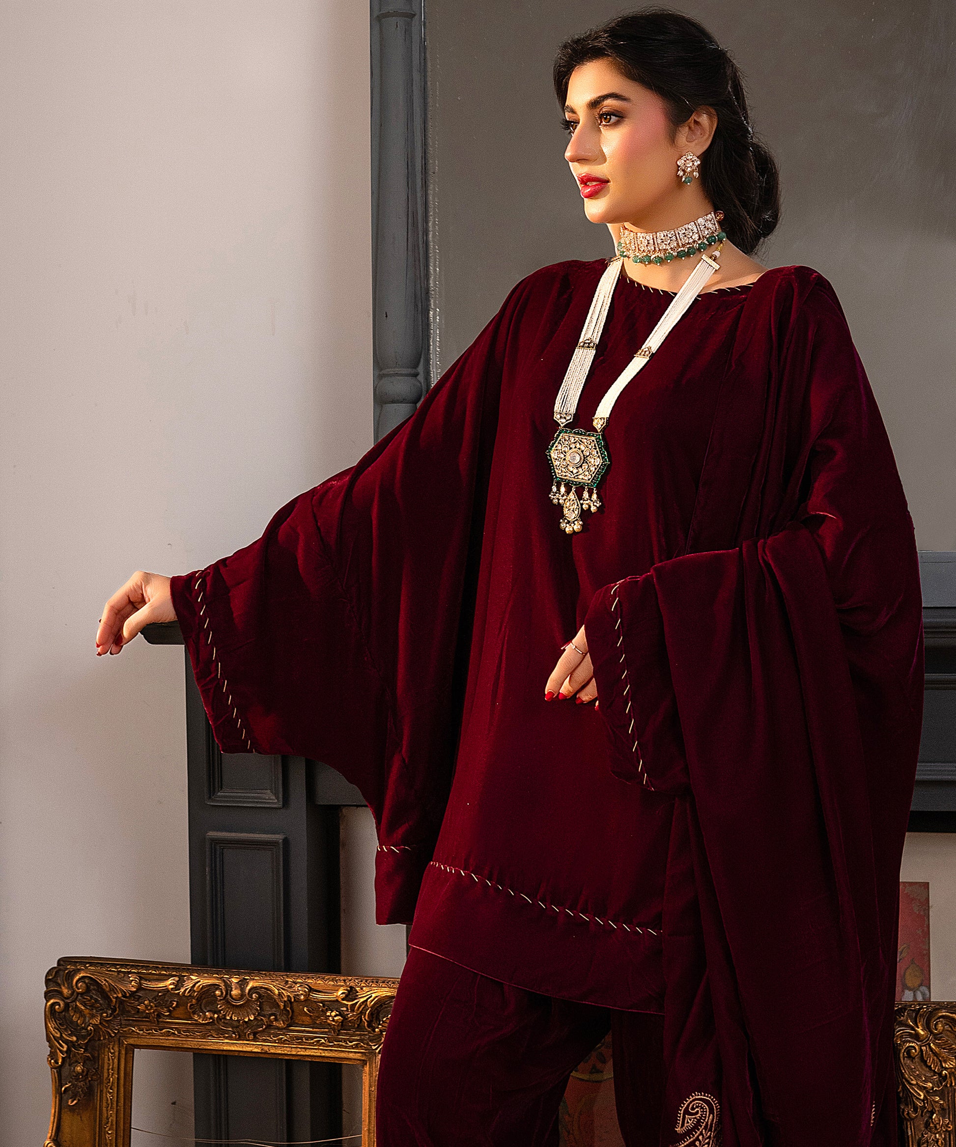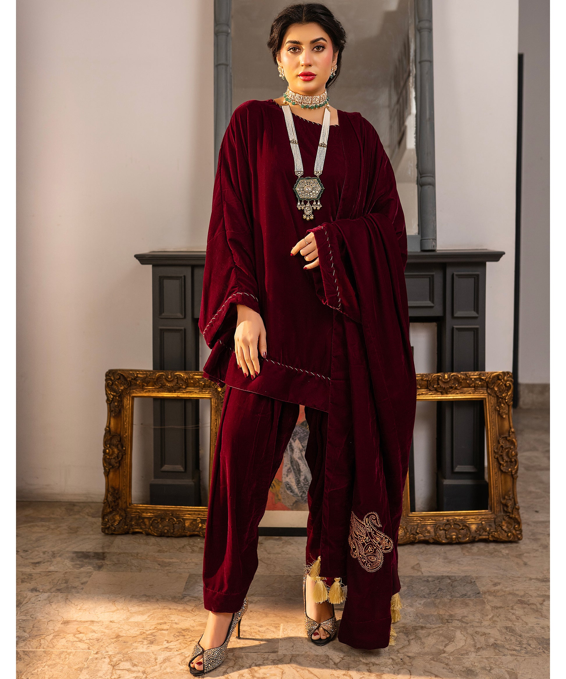 A richly detailed plum velvet peplum shirt paired with a skinny shalwar, exquisitely embellished with hand-worked Kacha Tanka along the sleeves, neckline, and daman. The look is completed with a matching velvet shawl, with shamose finishing intricately embroidered with Kashmiri paisleys and tassels on all four corners showcasing a poetic blend of heritage and elegance.